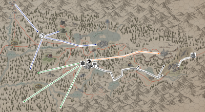 The surprise attack on the morning of Duesday 8 Meadow 825 involved Alfheim forces coming through the old north-west pass and in Beltan flying ships to engage the Dozar City Regional Guard regiment in Vallaki, while a combined dwarven and Kinlu force used portals to muster at the ruined keep of the recently revived Knights of the Silver Dragon. From there Kinlu forces headed south to engage the Caleen Walkers mercenary regiment, while the dwarves made use of the drow’s inclement weather effects to form an ice road along the Mondfluss to Borovia Town where they were joined by Borovian forces arriving through the East Gate.
