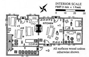 The kitchen is has basic implements for the peasant which include a trestle table and a few stools/benches. Cooking is accomplished in an iron caldron suspended over the fire, and the main meal of the day (at noon) generally consists of some sort of soup/stew, served with bread. Often a homemade chest or two in the corner which will contain wooden plates and spoons. Sometimes their is pewter plates for special occasions, and will have grain stored in earthen vessels stored in the kitchen.