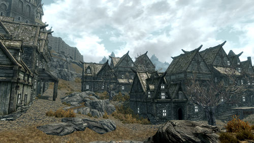 Some are stave-built of vertical boards, some are cut stone plaster covering walls, and some are log huts, with clay caulking to seal gaps and keep out drafts. There area in front of the main door was often paved with large stones. The hearth is in the centre of the building, and outbuildings - barns, stables and the like - were to the rear. In towns the buildings are smaller, and the main doorway is in one of the narrow ends, which faces onto the earth streets.