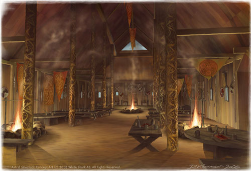 Some are stave-built of vertical boards, some are timber framed with wattle-and-daub covering walls of hurdlework, and some are log huts, with clay caulking to seal gaps and keep out drafts. There area in front of the main door was often paved with large stones. The hearth is in the centre of the building, and outbuildings - barns, stables and the like - were to the rear. In towns the buildings are smaller, and the main doorway is in one of the narrow ends, which faces onto the earth streets.