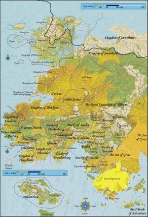 The baronies are seperated by the Western Kingdom which splits the area in half. While referred to as baronies they contain a number of independant baronies, counties and kingdoms.